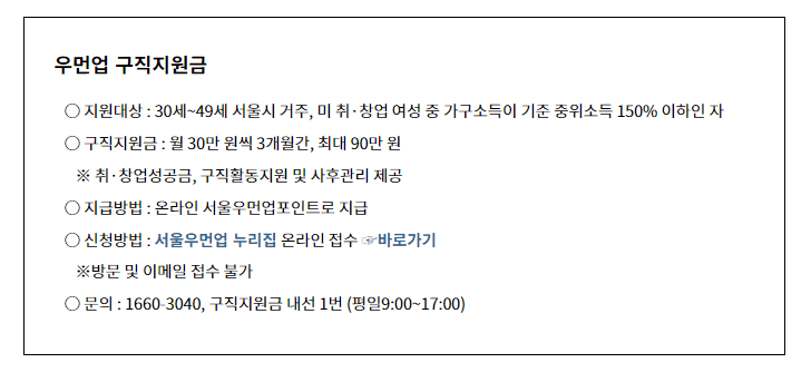 1.우먼업 구직지원금 : 구직활동에 사용할 수 있으며 30만 원씩 3개월 지원합니다