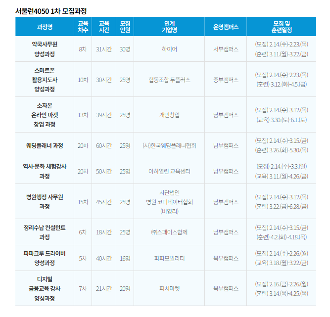 ▶1차 모집 : 2월 14일 오전 9시부터 50 플러스포털 → 일자리+ → 일자리신청에서(재)취업할 의지가 있는 서울시 중장년(40~64세)이라면 누구나 무료로 신청이 가능하며, 과정별로 서류와 면접 전형을 통해 취업의지 및 역량등을 평가해 최종 선발됩니다