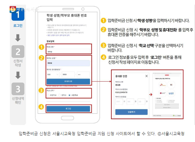 시작일 오전 9시에 열리는 서울시교육청의 입학준비금 신청시스템을 통해 신청할 수 있습니다. 신청방법은 사이트 접속 후 신청하기 버튼을 누르고 학생과 학부모 이름, 휴대번호와 입학 예정 학교 등의 정보를 순서대로 작성하면 됩니다. 신청이 완료되면 학교에서 대상자 확인 후 신청한 휴대폰 번호로 제로페이 모바일 포인트를 지급하는데 약 3~4주가 걸릴 수 있습니다.